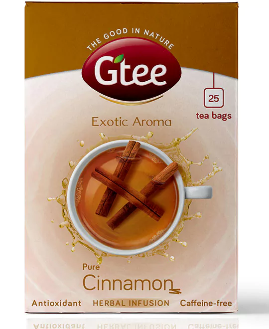 Gtee Cinnamon Herbal Infusion contains Original 100% Ceylon Cinnamon Bark. With an Exotic Aroma, this spicy revitalizer is a natural and tasty way to protect your body and mind. Cinnamon bark supports weight loss and reduces sugar level. Enjoy this spicy delight for a lively day!