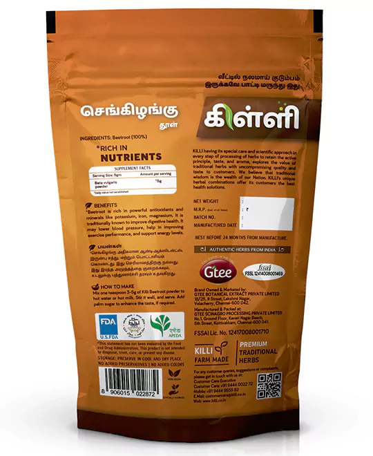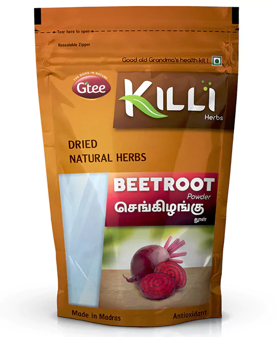 Mix one teaspoon 3-5g of Killi Beetroot powder to hot water or hot milk. Stir it well, and serve. Add palm sugar to enhance the taste, if required.
