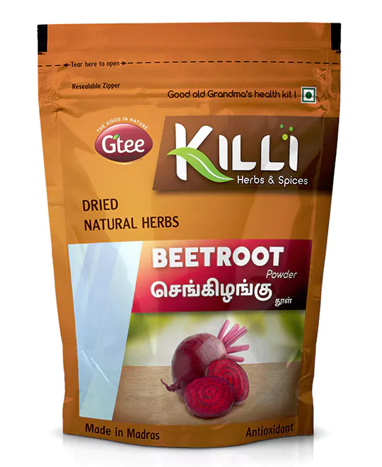 Mix one teaspoon 3-5g of Killi Beetroot powder to hot water or hot milk. Stir it well, and serve. Add palm sugar to enhance the taste, if required.