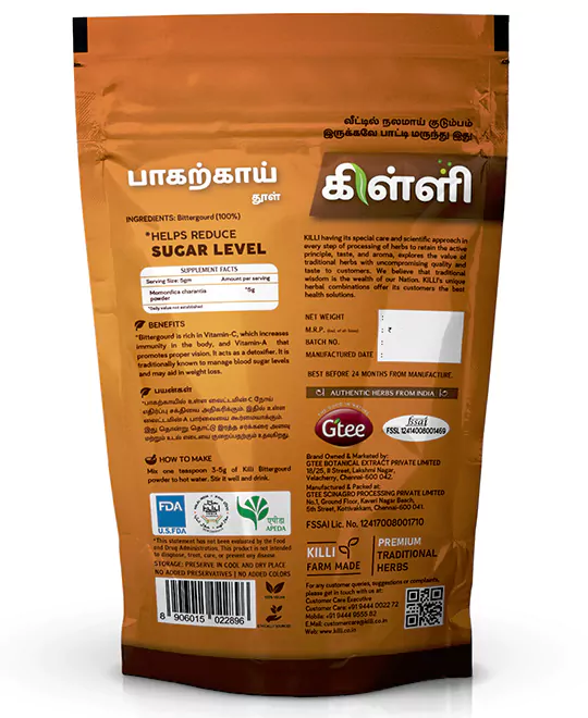 Mix one teaspoon 3-5g of Killi Bittergourd powder to hot water. Stir it well and drink.