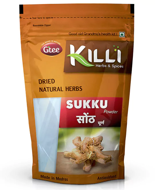 Mix one teaspoon (2-3g) of Killi Sukku powder with 150ml of hot water or milk and drink when required. To 1 spoon of sukku powder add cinnamon, cardamom, clove and fennel, boil for 2-3 mins, filter and serve a perfect cup of sukku tea. Adding a pinch of this spice in curries and masalas adds flavor and taste to the dish.