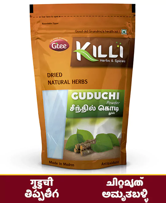 Mix half a teaspoon (2-3g) of Killi Guduchi powder with 150ml of hot water and serve hot. Add palm sugar to enhance the taste, if required.