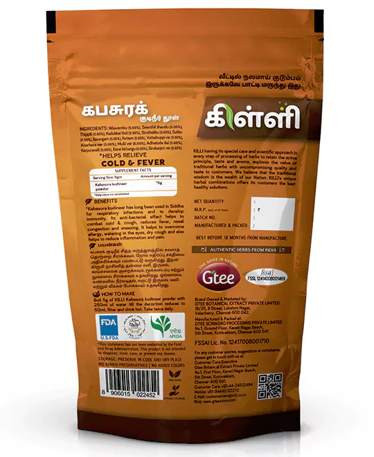 Kabasura kudineer has long been used in Siddha for respiratory infections and to develop immunity. Its anti-bacterial effect helps to combat cold & cough, reduces fever, nasal congestion and sneezing. It helps to overcome allergy, watering in the eyes, dry cough and also helps to reduce inflammation and pain.