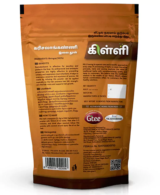 Mix half a teaspoon (2-3g) of Killi Karisalankanni powder with 150ml of hot water, filter after 2-3 minutes, and drink when required. Infuse this powder with coconut oil and apply the oil on the hair.