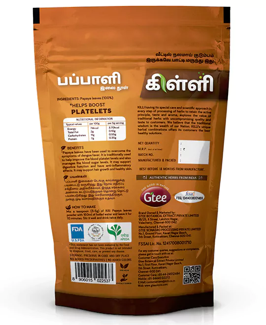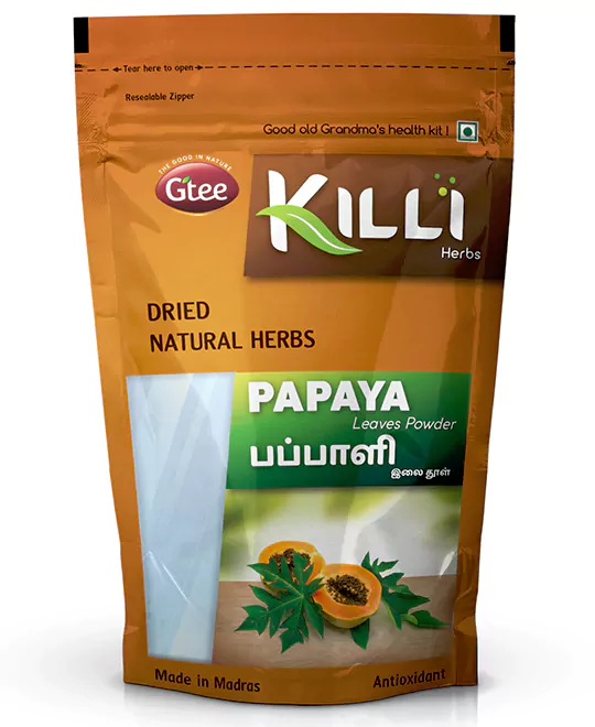 Mix a teaspoon (3-5g) of Killi Papaya leaves powder with 150ml of boiled water and leave it for 10 minutes. Stir it well and drink twice daily.