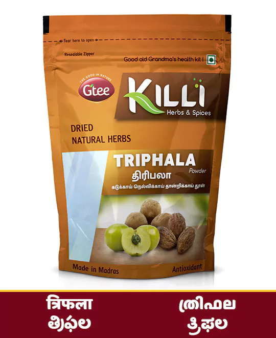 Mix one teaspoon (5g) of Killi Triphala powder with 150ml of warm water and drink daily in the night after food. Add palm sugar to enhance the taste, if required.